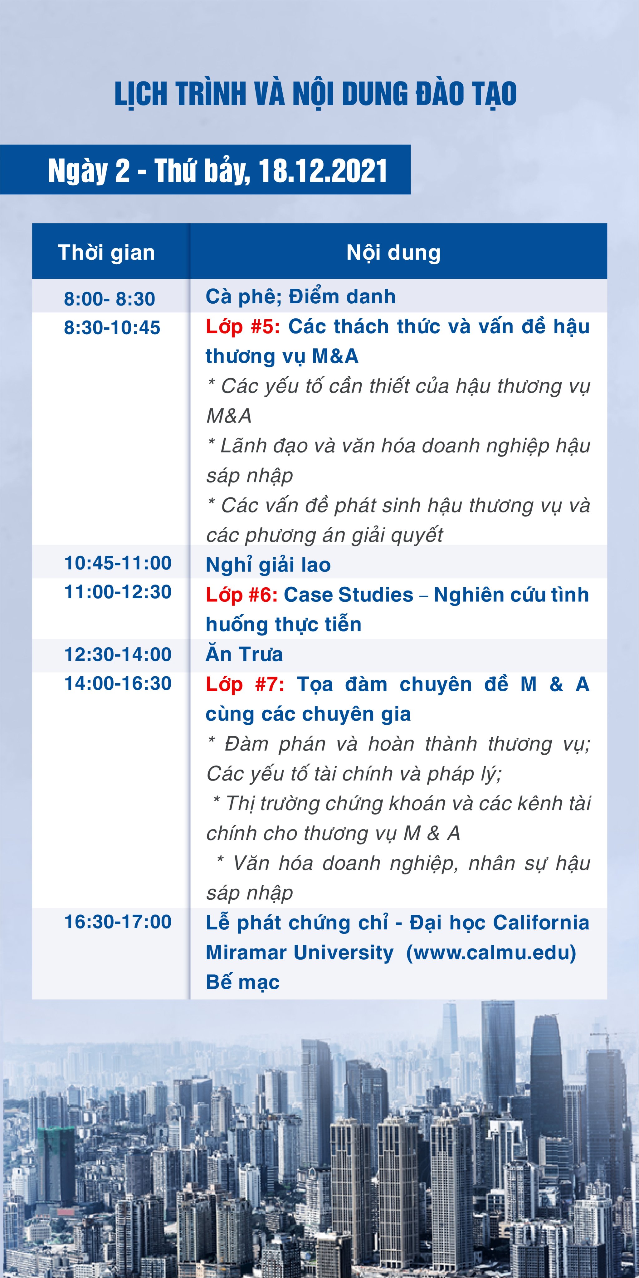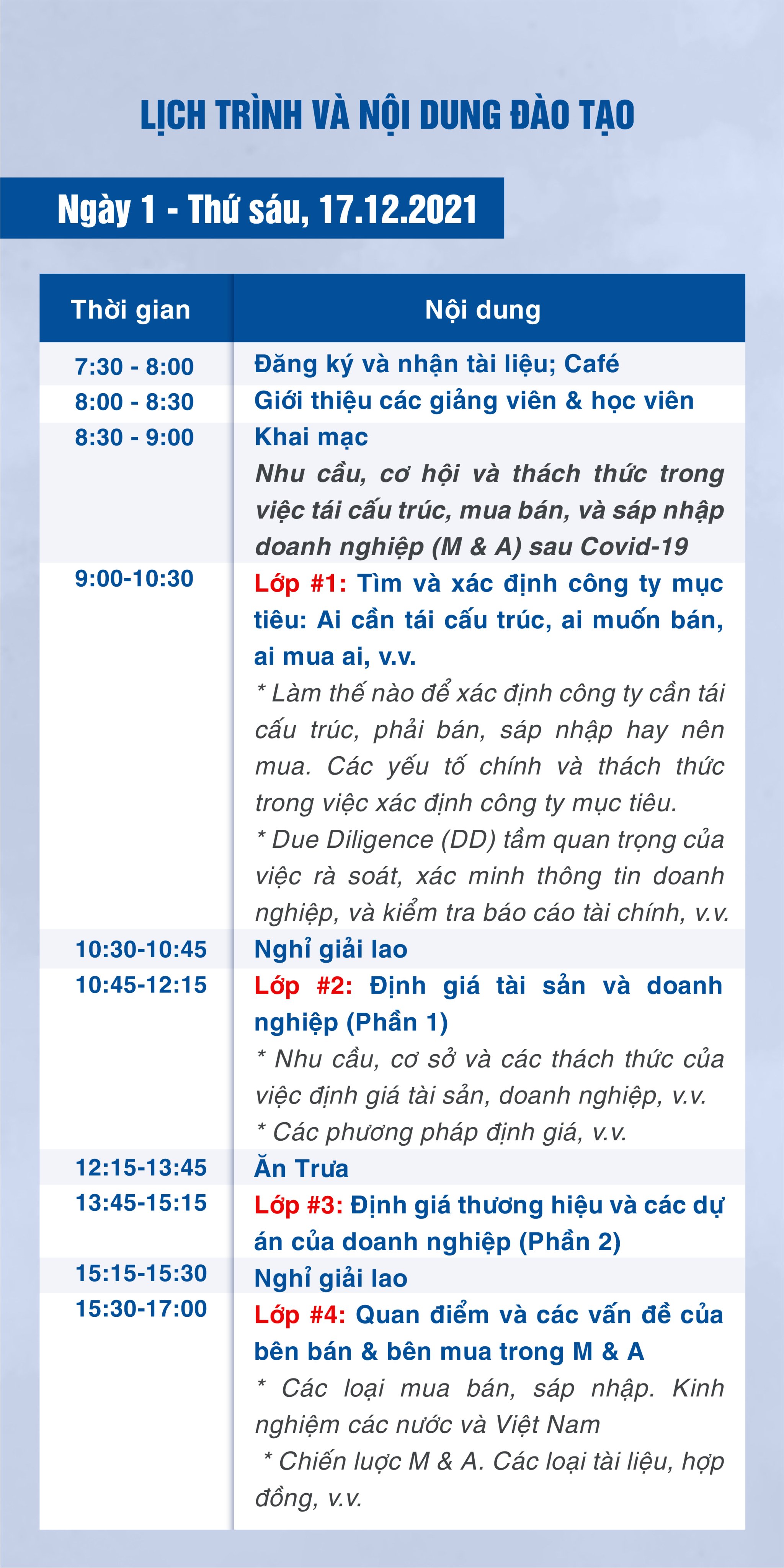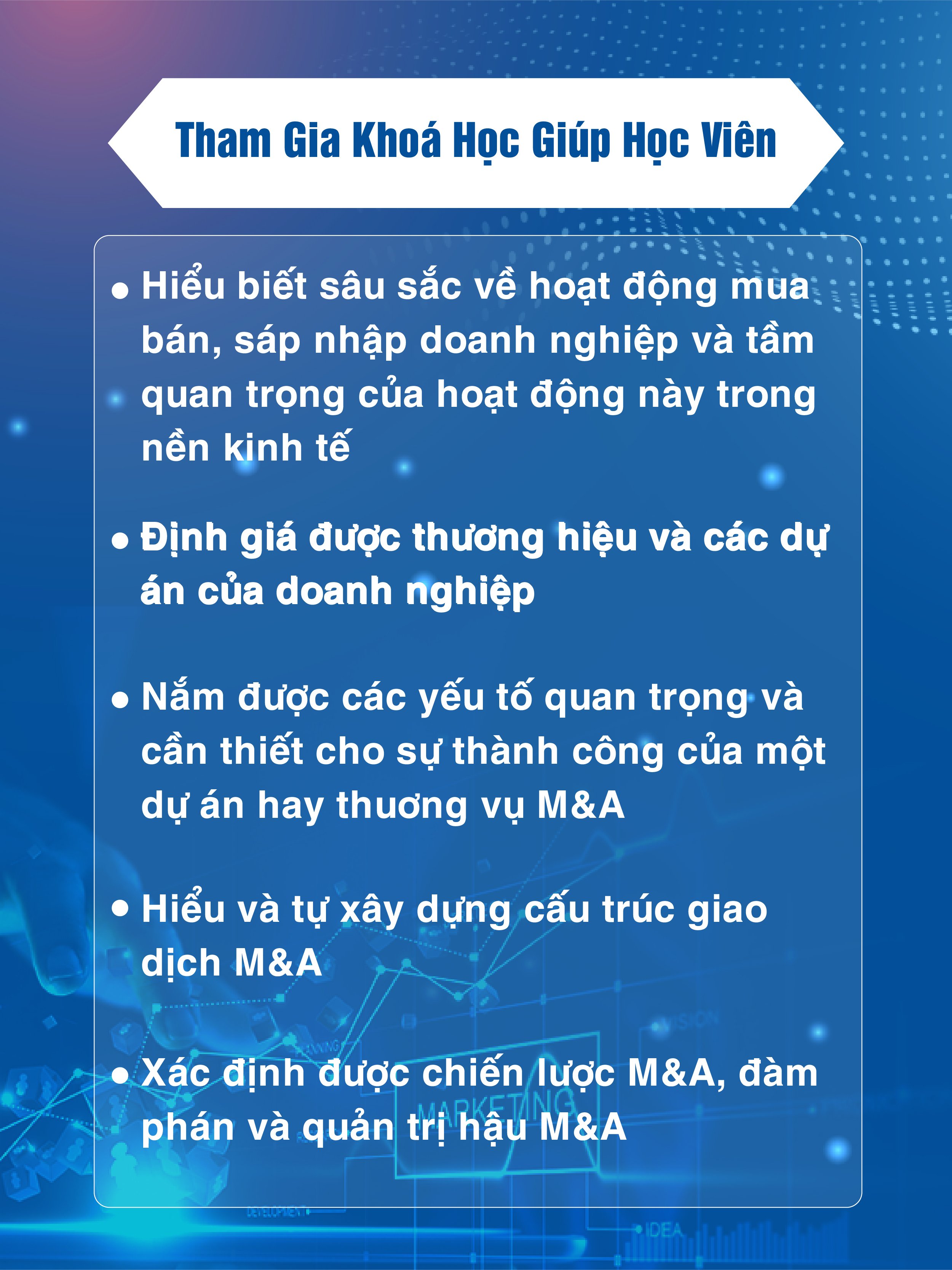 Khóa đào tạo gồm 7 lớp về lý thuyết, chiến lược, các công cụ định giá tài chính giúp các thương vụ mua bán, sáp nhập, hợp tác, và thâu tóm doanh nghiệp sẽ do các giảng viên quốc tế và Việt Nam nhiều kinh nghiệm giảng dạy, dẫn dắt và thực tập.